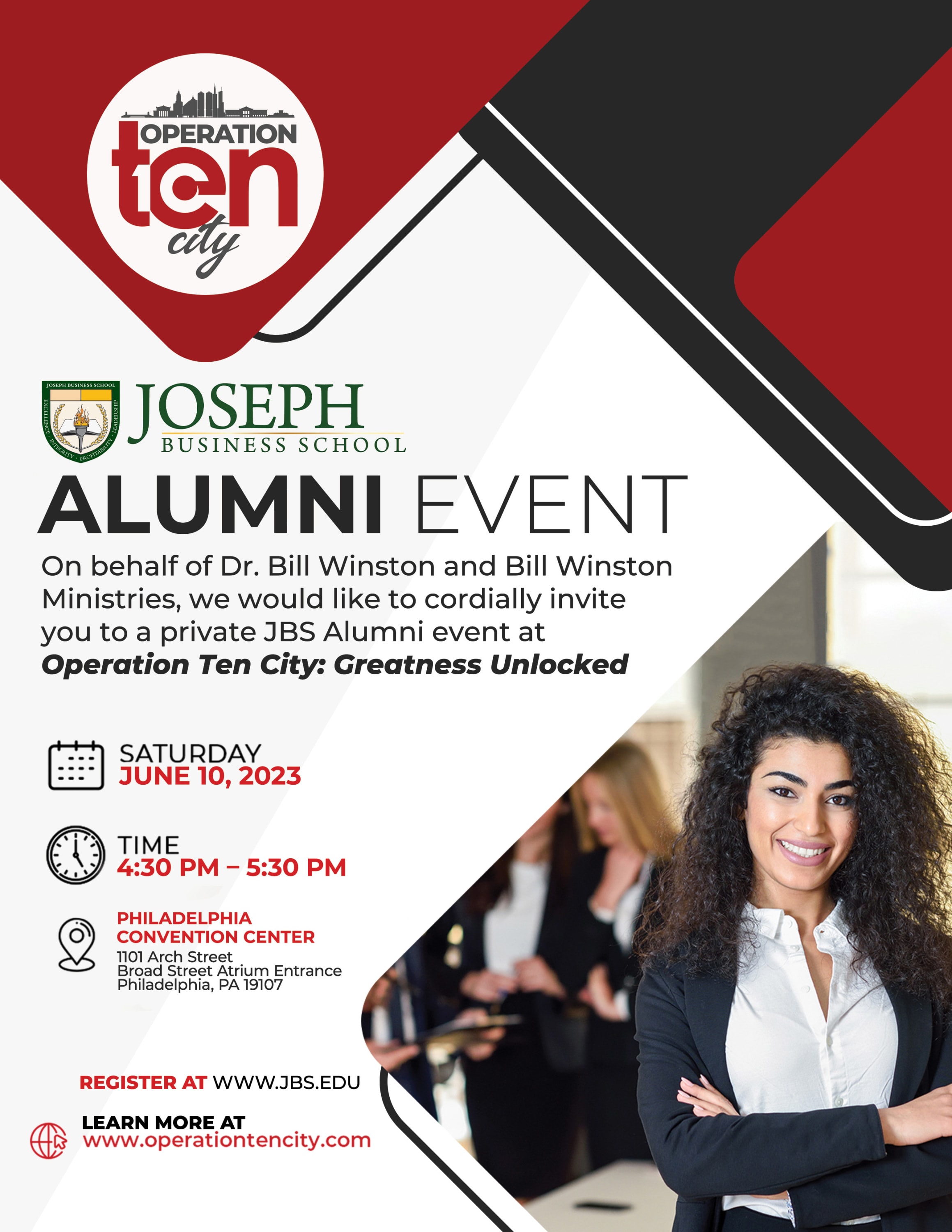 On behalf of Dr. Bill Winston and Bill Winston Ministries, we would like to cordially invite the JBS Alumni and our Kingdom Partners to Greatness Unlocked: Philadelphia on Saturday, June 10, 2023, 4:30 PM - 5:30 PM at the Philadelphia Convention Center.